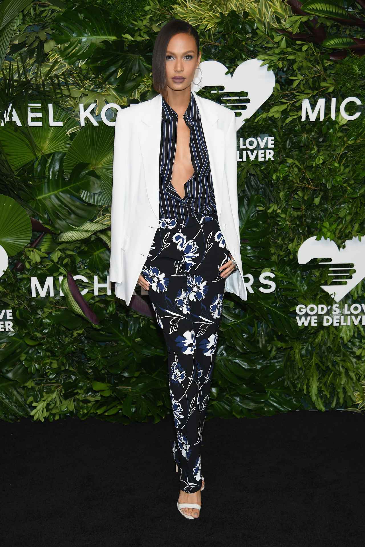 モデルのジェシカ・ハートは、マイケル・コースの繊細かつ大胆なシルバーのスパンコールのトラウザーにシャツを合わせ、胸元にネックレスを重ねづけしたトレンドセッターな着こなし。