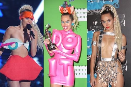 2013年のMTV VMAでのパフォーマンスで世間を騒がせたマイリーが、2年後に同音楽祭の司会に抜擢! 11回の衣装替えで華を添えた。