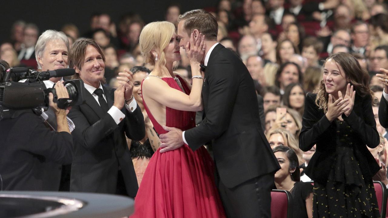 受賞スピーチのためにアレクサンダーがステージに向かう途中、同ドラマで彼の妻を演じる女優のニコール・キッドマンに挨拶すると、なんと彼女のほうからアレクサンダーの唇にキス! しかもニコールのすぐそばに彼女の夫キース・アーバンがいたことから、大勢の人たちがこの奇妙な光景に騒然とした。