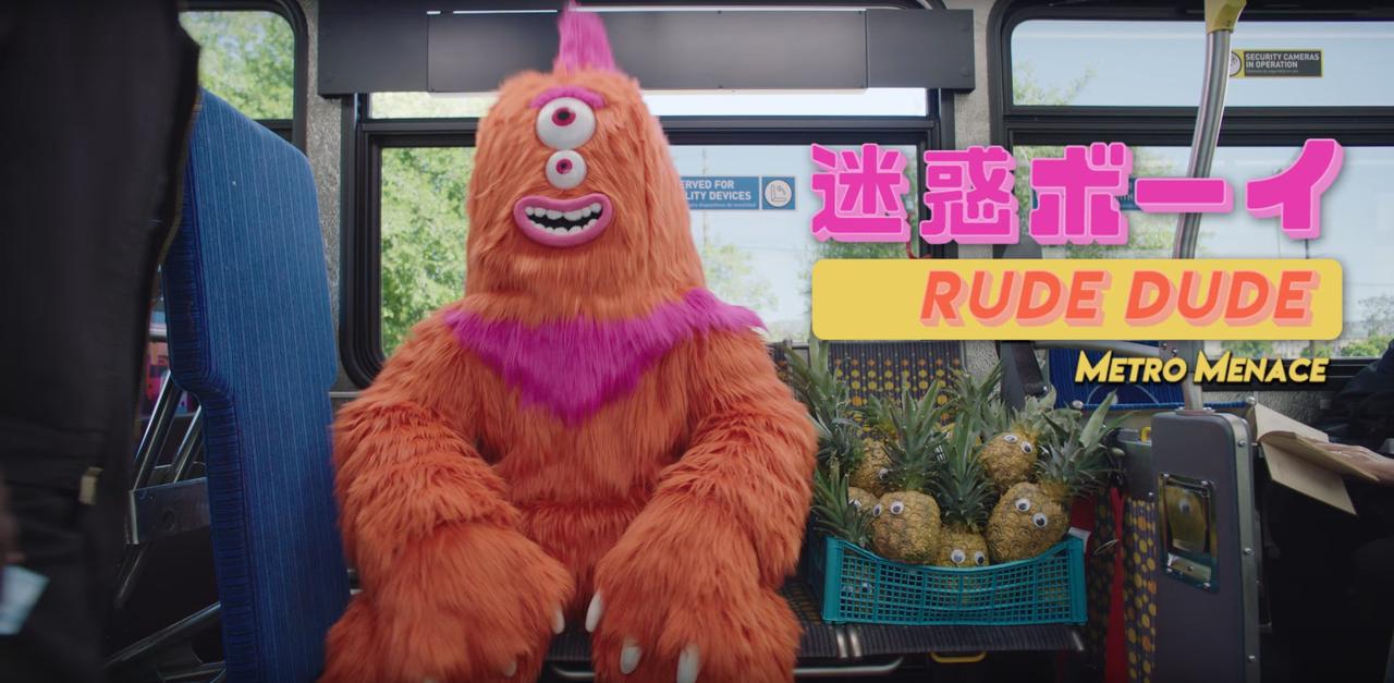 この動画のストーリーは、地下鉄やバスに迷惑怪獣が登場してさまざまな迷惑行為をするなか、女戦士「スーパーカインド(超親切)」が登場して解決する、というもの。