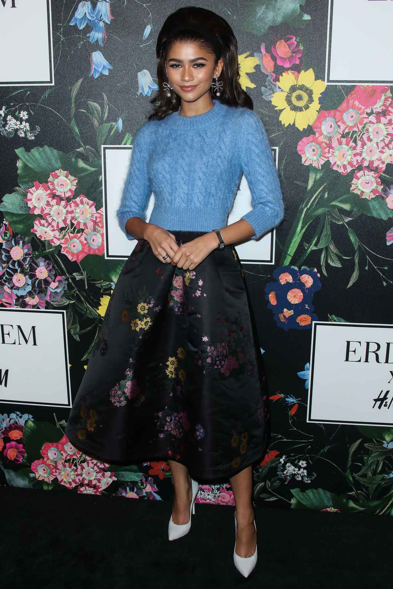 アイスブルーが鮮やかなケーブルニットに、花柄のフレアスカートをセットしてレディにまとめたゼンデイヤ。ヘアはボリュームたっぷりのレトロ風。