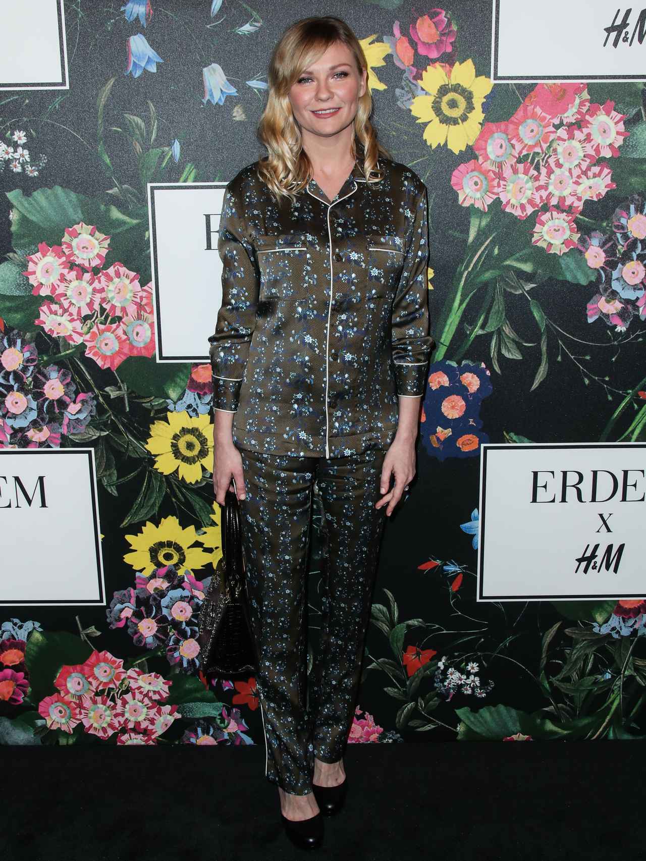 花柄の全身パジャマルックを、シックなハンドバッグと黒パンプスでデイリーに落とし込んだキルスティン。