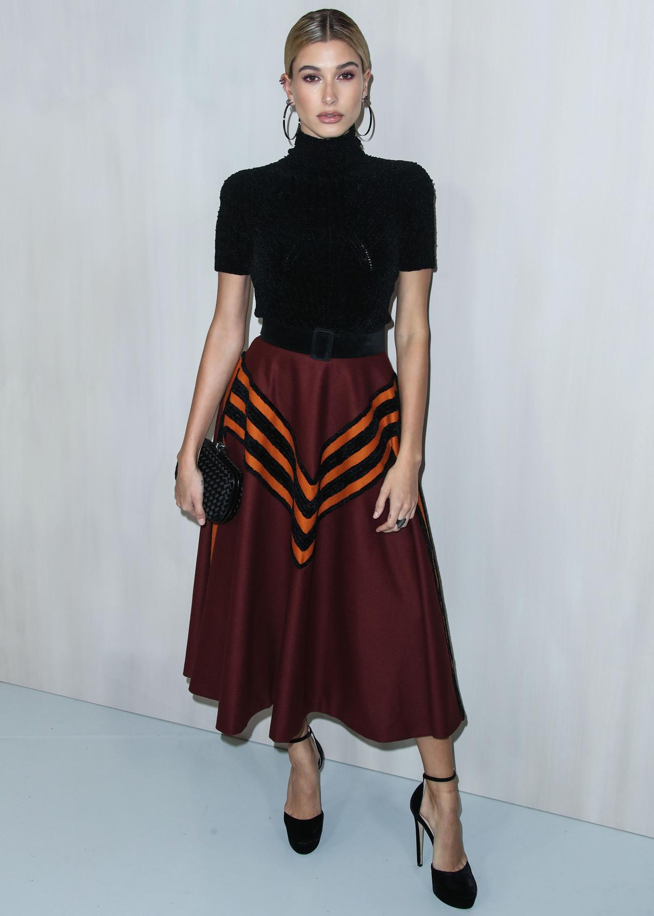 全身BOTTEGA VENETAでまとめたヘイリーは、体にぴたっとフィットするタートルネックニットに、ラインが効いたフレアスカートをセットしてエレガントに。ボルドーカラーで秋を意識したヘイリーは、アイメイクもボルドーで統一。