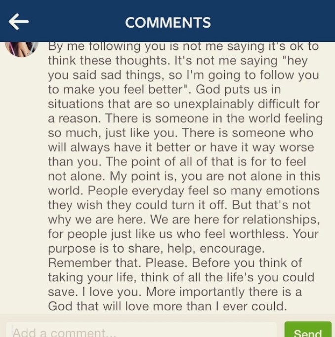 すると、多くのフォロワーやセレーナファンたちが、自殺を考え直すようコメントを送り、さらにセレーナをタグ付けして、セレーナが気付いて何か行動を起こしてくれるよう促した。