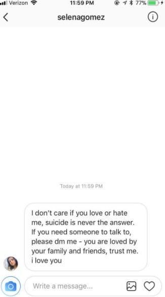 するとセレーナ本人にファンたちの声は届き、セレーナは自分のファンが自殺しようとしていることを知る。そこで、セレーナは直接この女性にインスタグラムでダイレクトメッセージを送った。