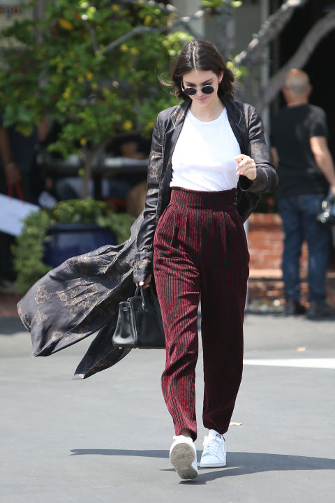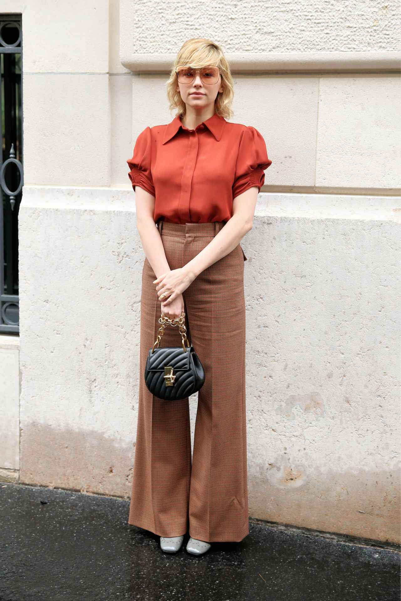 今注目の女優ヘイリーは、袖がきゅっと絞られたテラコッタオレンジのシャツを、チェック柄のワイトパンツに合わせ、サングラスもオレンジカラーでバランスを計算。