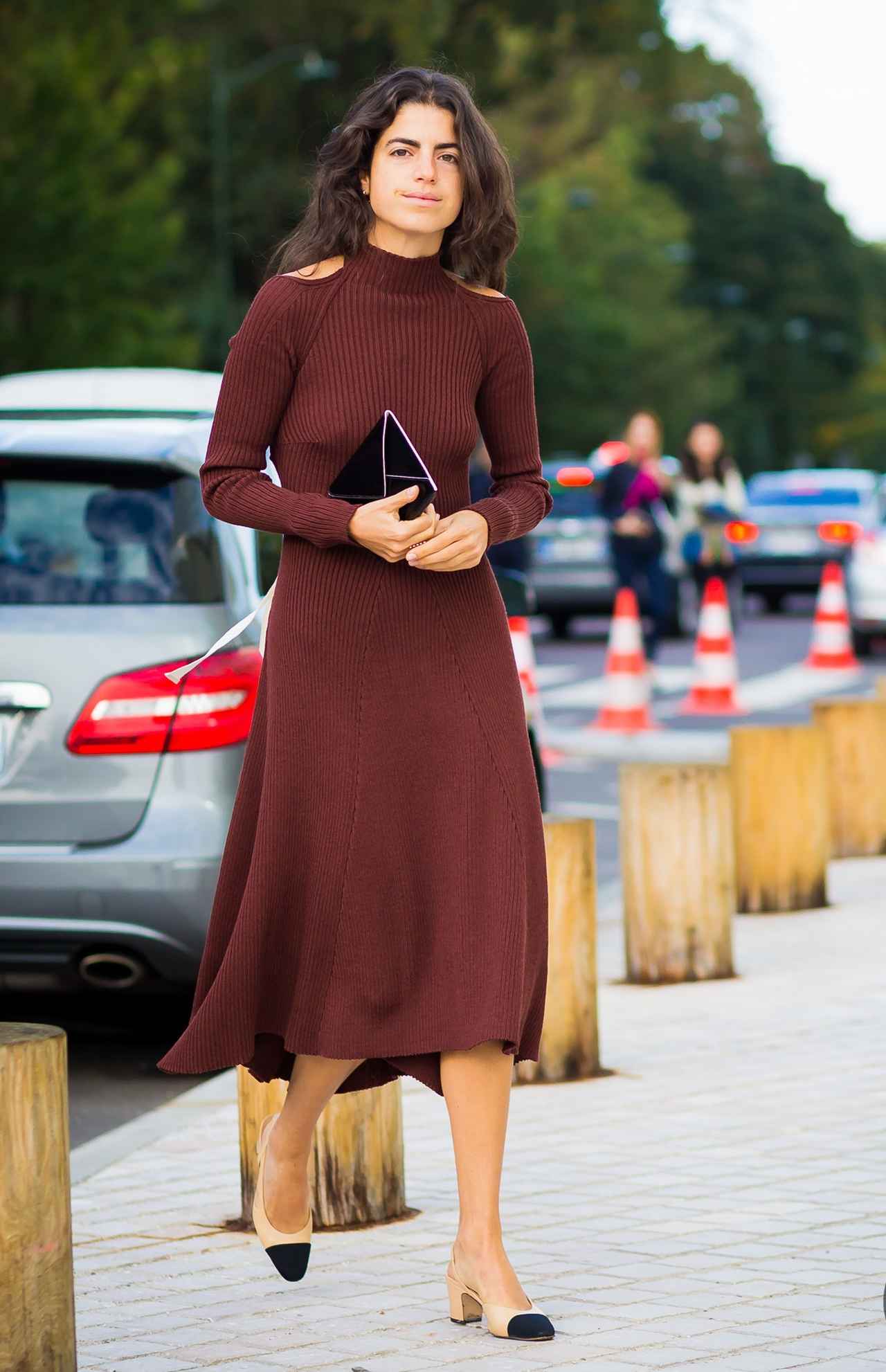 肩がカットアウトされたCÉLINEのニットドレスは深みのあるレッドブラウンで、大人シックに。足元はCHANELのヌーディなヒールでドレスを引き立てて。