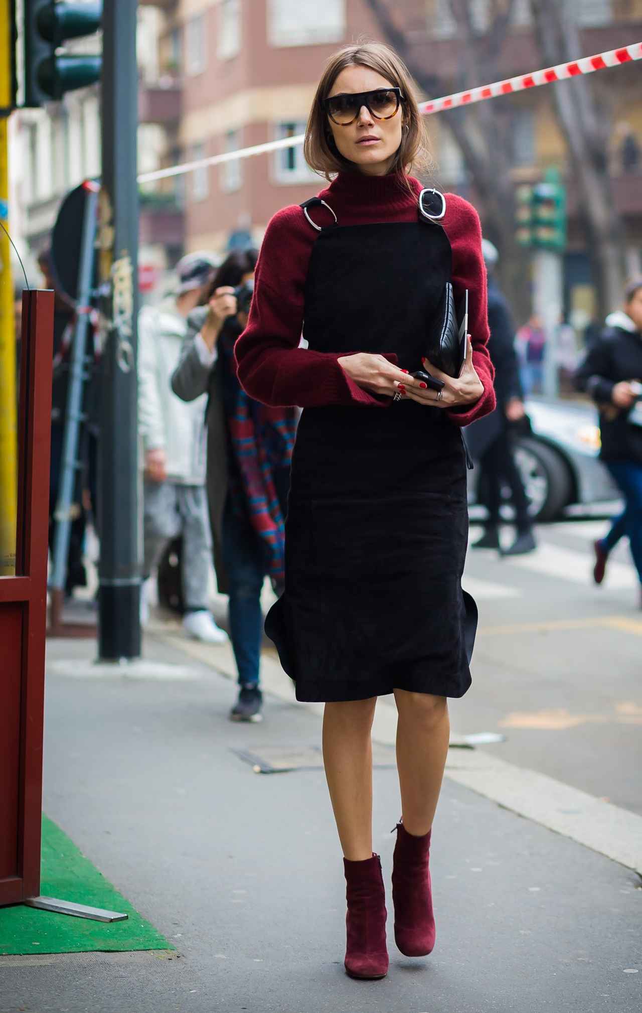 レトロなジャンプスカートにバーガンディのタートルネックニットを重ねたジョージア。足元もバーガンディカラーのスエード生地ブーツで秋を意識。髪をタートルネックにインしてこなれ感を出して。