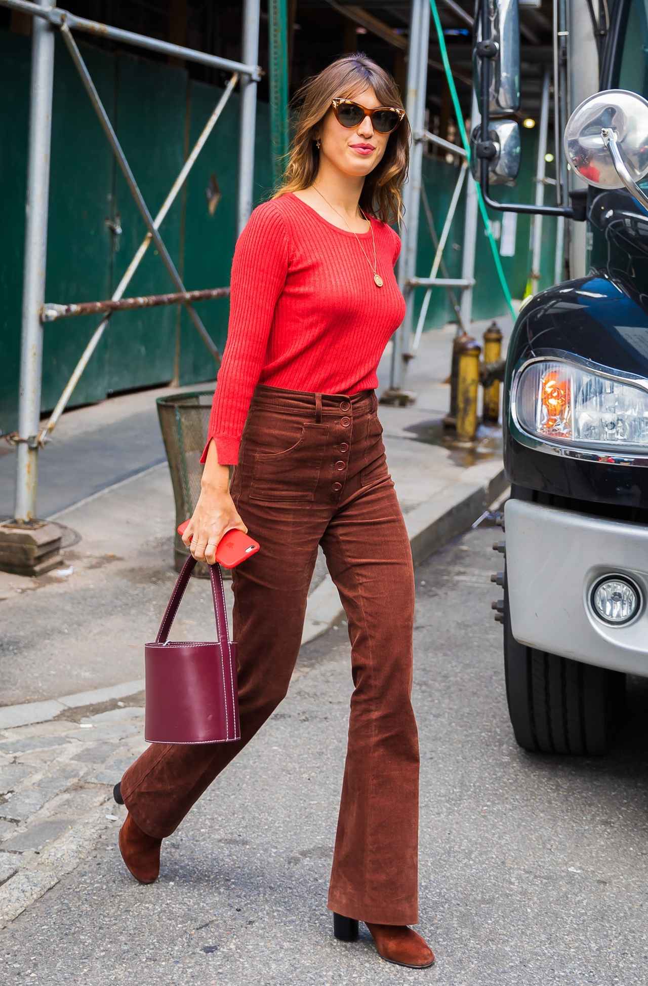 鮮やかな赤ニットにジャンヌが合わせたのは、レッドブラウンのハイウエストパンツ。足元も同色ブーツで統一させ、レトロなムードに。バッグはバーガンディカラーを選んで小粋にフィニッシュ。