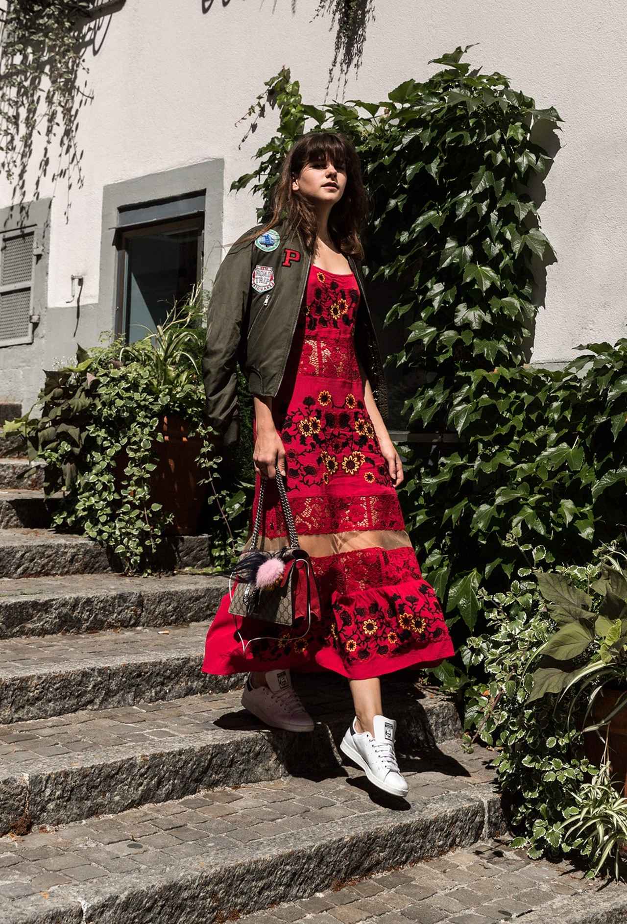 For Love & Lemonsのドラマチックな花柄×レースの赤色ドレスを、TOPSHOPのボンバージャケットとスタンススミスでカジュアルダウン。バッグはGUCCI。