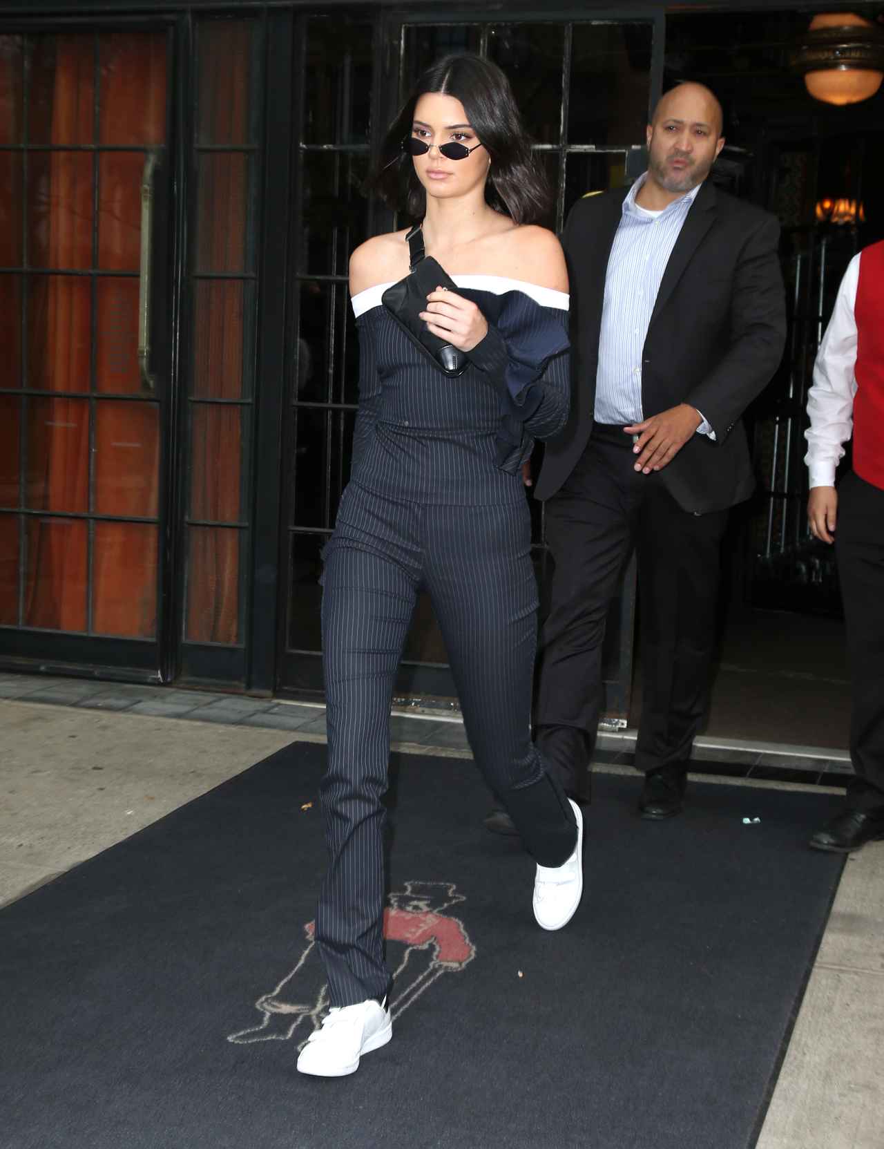 BEC & BRIDGEの最新リゾートコレクションからピンストライプのセットアップをチョイスしたケンダル。そこにスタンススミスの白スニーカーで抜け感を出して。肩にかけたウエストポーチはPRADA。