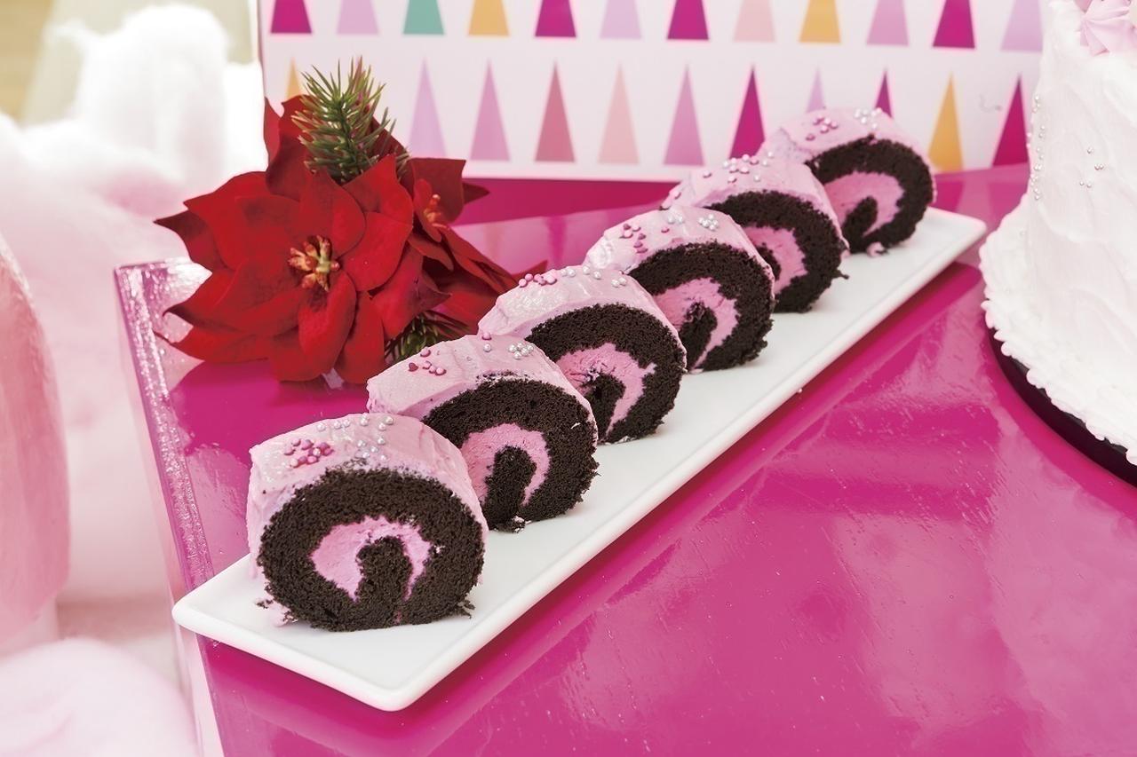 トナカイに代わってソリを引くのは、ピンクのサンタ帽を身につけたショッキングピンクのフラミンゴ。ピンクと紫を基調にしたクリスマスツリー形の特製シェルフに並ぶクリスマススイーツは、ブッフェ台のピンクデコレーションに引けを取らないほどフォトジェニック。