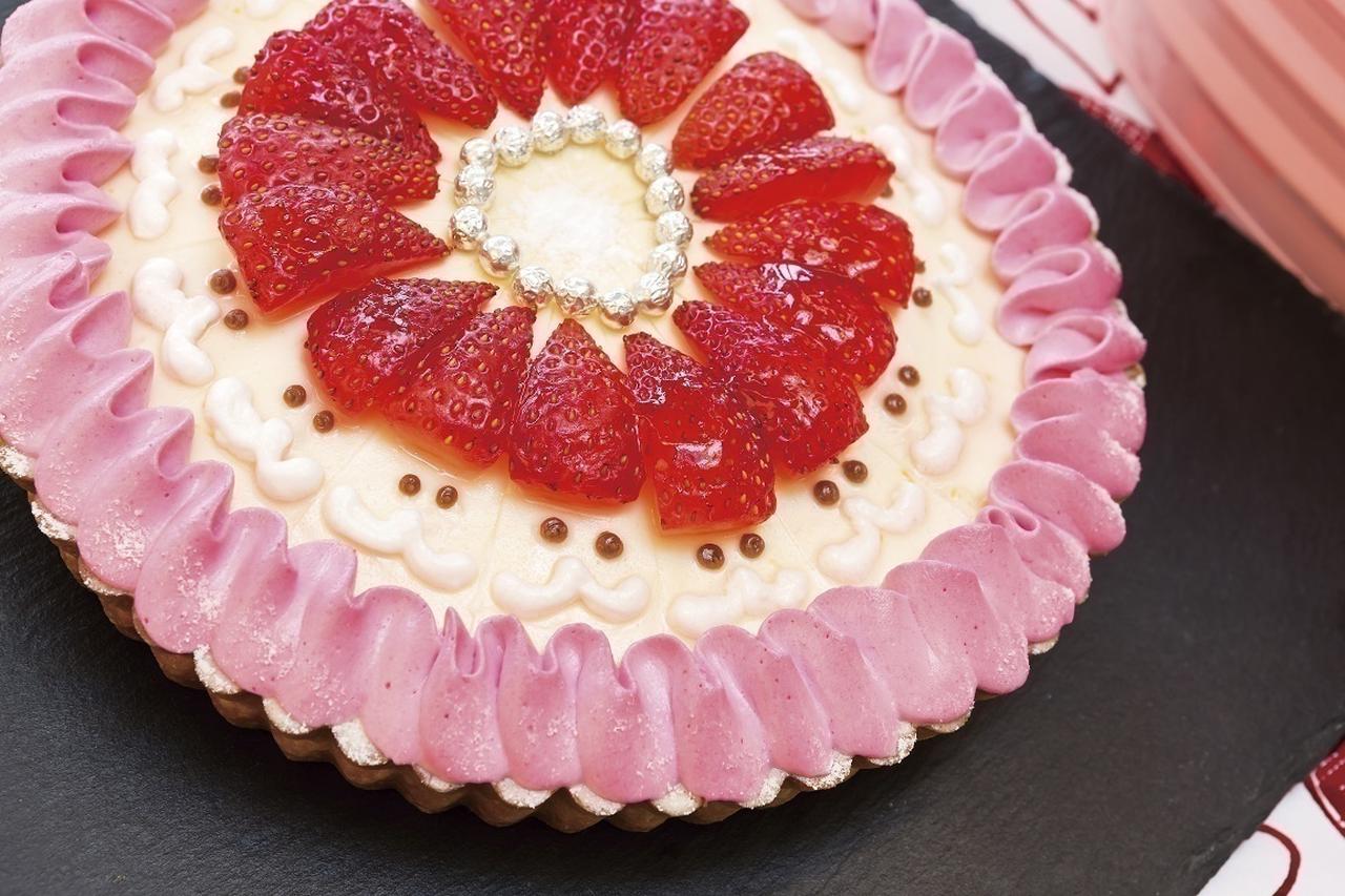 タルトはアーモンドクリームの生地でできており、スライスしたイチゴをのせ、その上にレモンムースをはさんでいる。