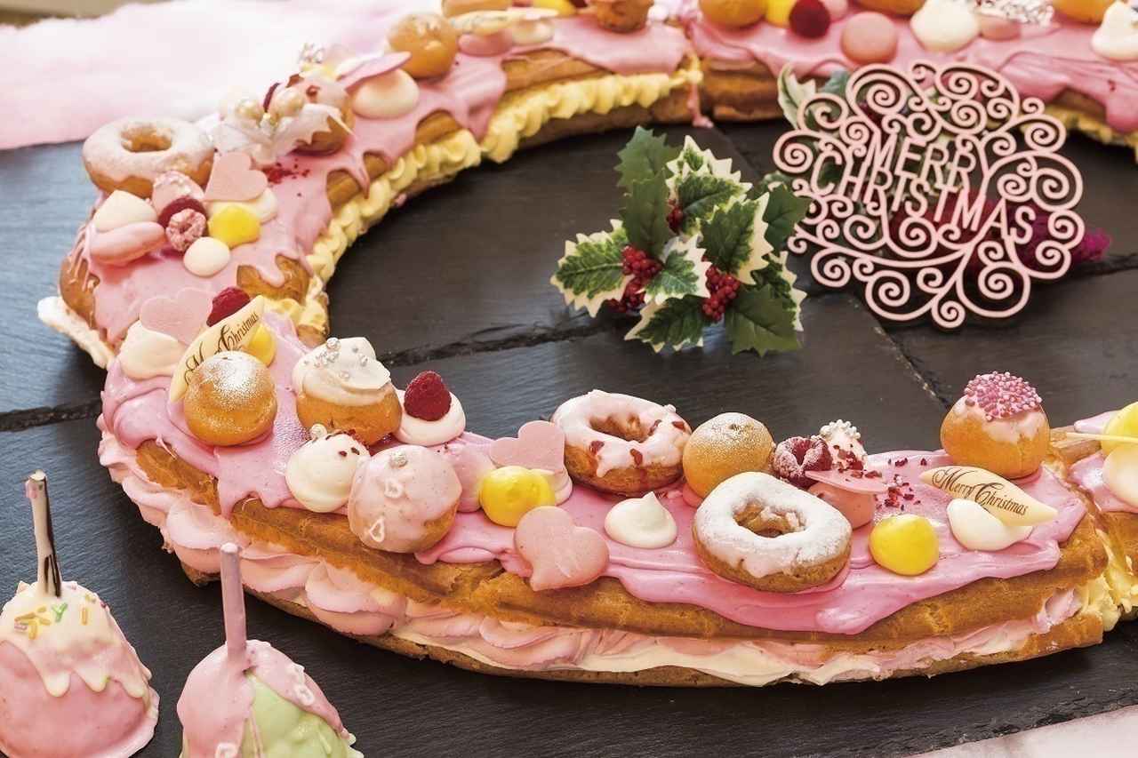 フランスを代表するパイ・シュー菓子であるパリブレストを、直径約60cmの巨大サイズでご用意。まあるく大きなピンクのパリブレストには、「愛にあふれた素敵なご縁(円)がありますように」という願いを込めています。プチシュークリームやハートのチョコレートを乗せて、愛らしい仕上がりに。
