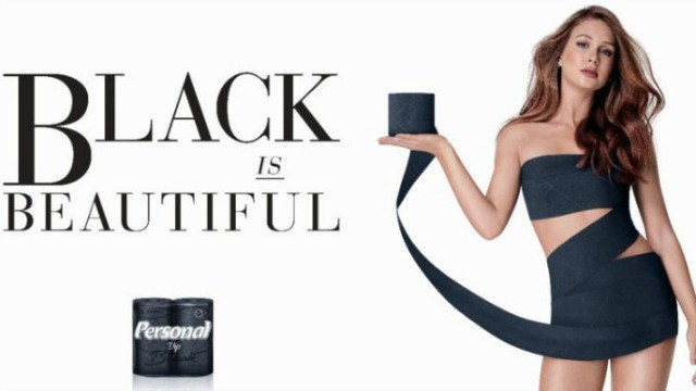 黒いトイレットペーパーにくるまった白人女性が写るこの広告には、「ブラック・イズ・ビューティフル(Black Is Beautiful)」というスローガンが掲げられている。