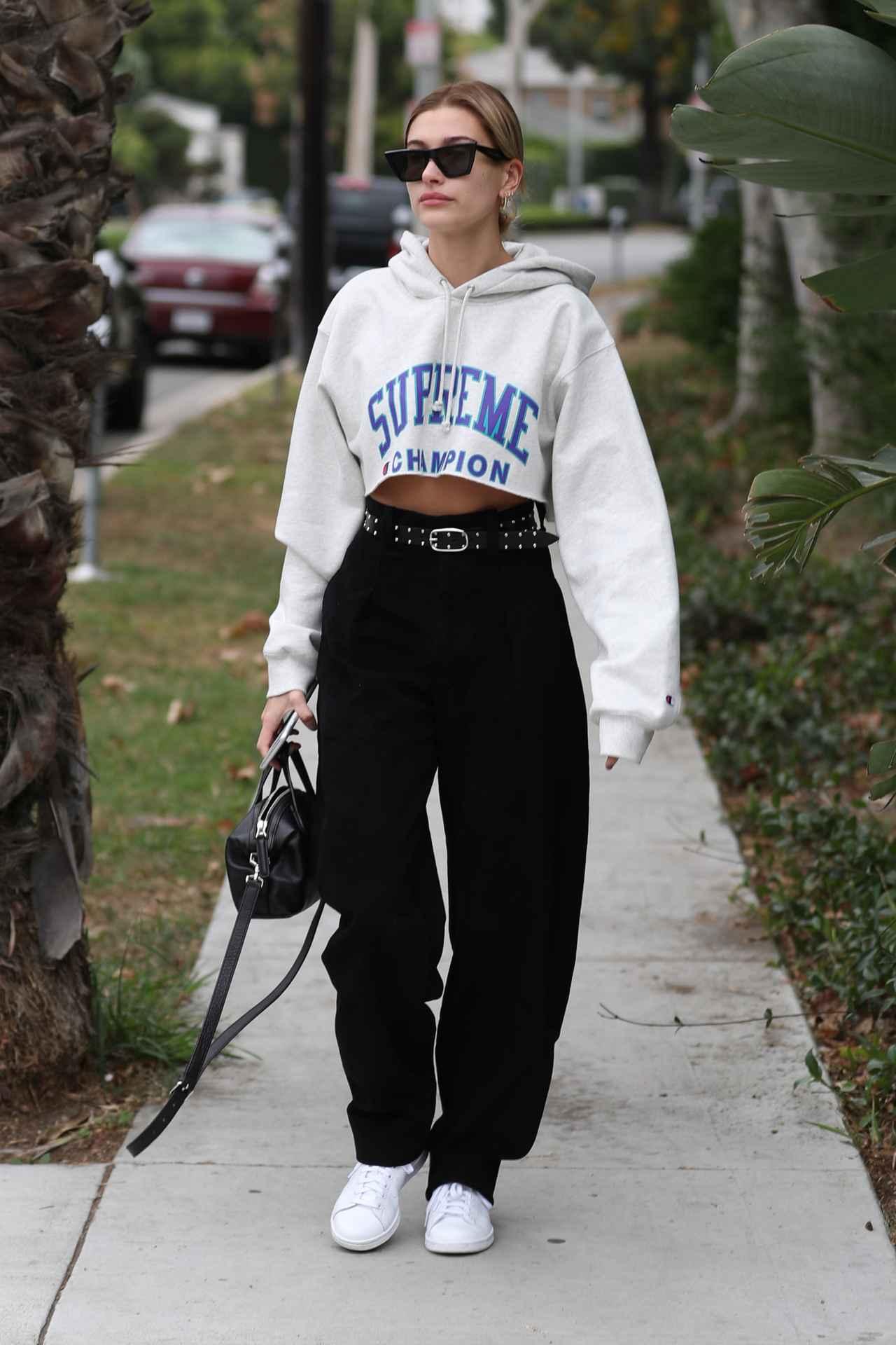 数日後ウエスト・ハリウッドでキャッチされたヘイリーは、クロップト丈フーディにハイウエストのゆったりめパンツをセットしてお腹をチラ見せ。そこに白スニーカーでさらにカジュアル感を盛り上げ、さすがストリートの上級者ともいえるスタイルの完成。