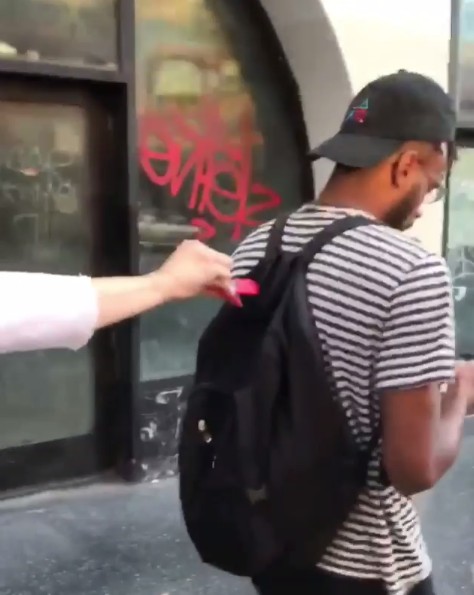 どういうイタズラかというと、おもちゃのヘビに紐をつけ、先端にクリップをつけたものを用意したクリステンは、街中を歩いている人の服やバッグに気付かれないようにクリップをつけ、「ねえ!ヘビがいるよ!」と声をかけるというもの。