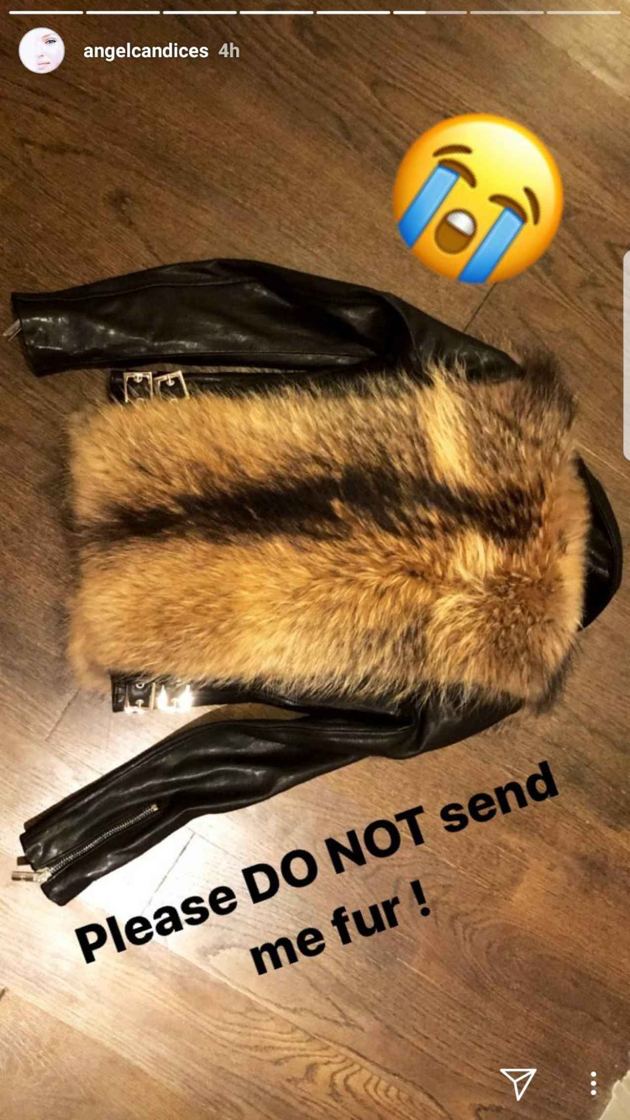 キャンディスは、送られてきたブランドは明かしていないもののファーが付いたレザージャケットの写真の上に、「お願いだから私にファーは送ってこないで」と書き、泣き顔の絵文字と共にインスタグラムに投稿した。