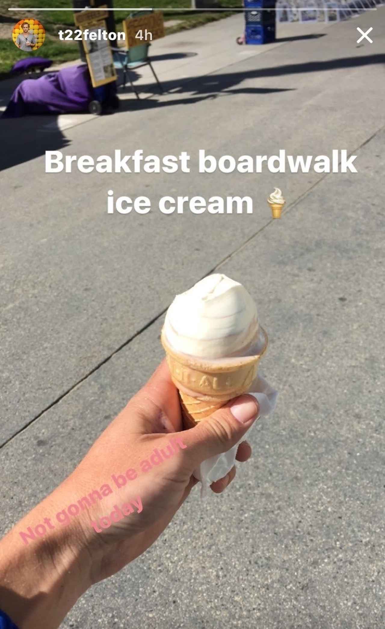 トムが「大人やめる」宣言した写真には、アイスクリームを片手に食べ歩きしている姿が写されており、「Breakfast boardwalk ice cream(朝ごはんは散歩道でアイスクリーム)」と書かれている。