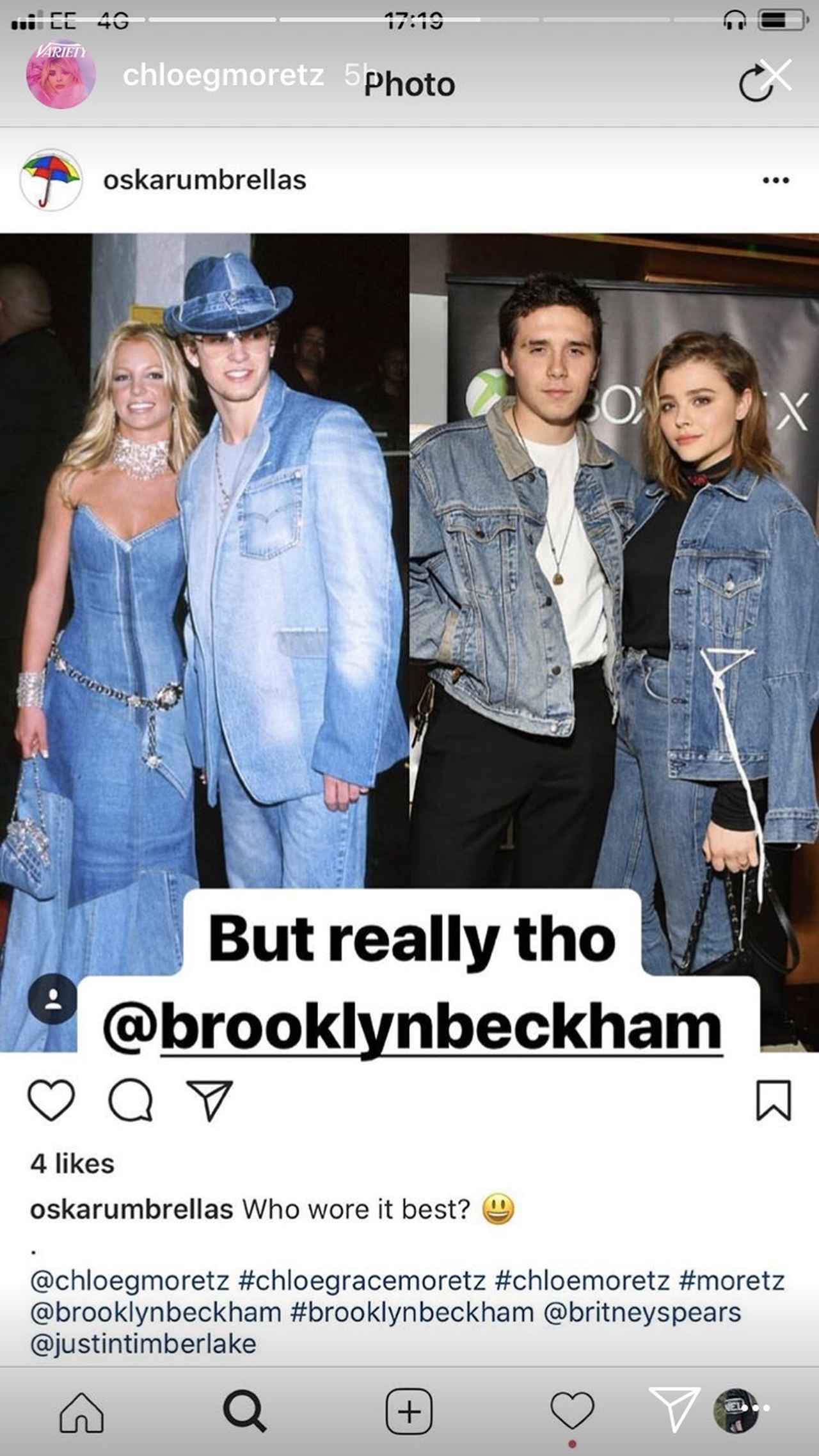 2人は、それぞれデニムジャケットを着ており、お揃いのデニムコーディネートで姿を現し視線を奪った。その後クロエは、過去に交際していたブリトニー・スピアーズとジャスティン・ティンバーレイクのアイコニックな全身デニムのお揃いコーデと自分たちを比べたファンの投稿をアップしていた。