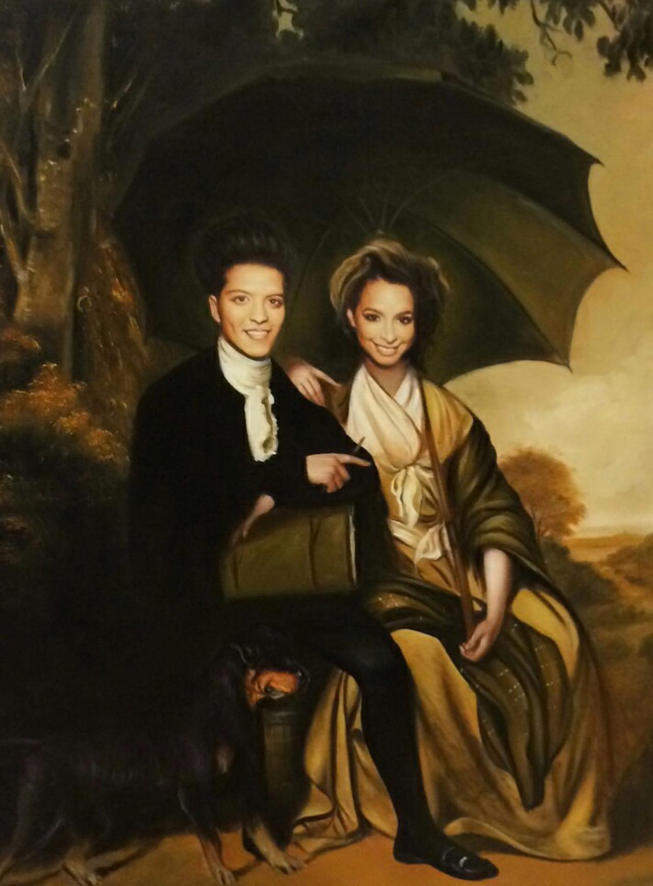 Bruno Mars has got a unique gift to mark his 29th birthday - a reproduction of a famous 18th century oil painting featuring the star, his model girlfriend and his dog.