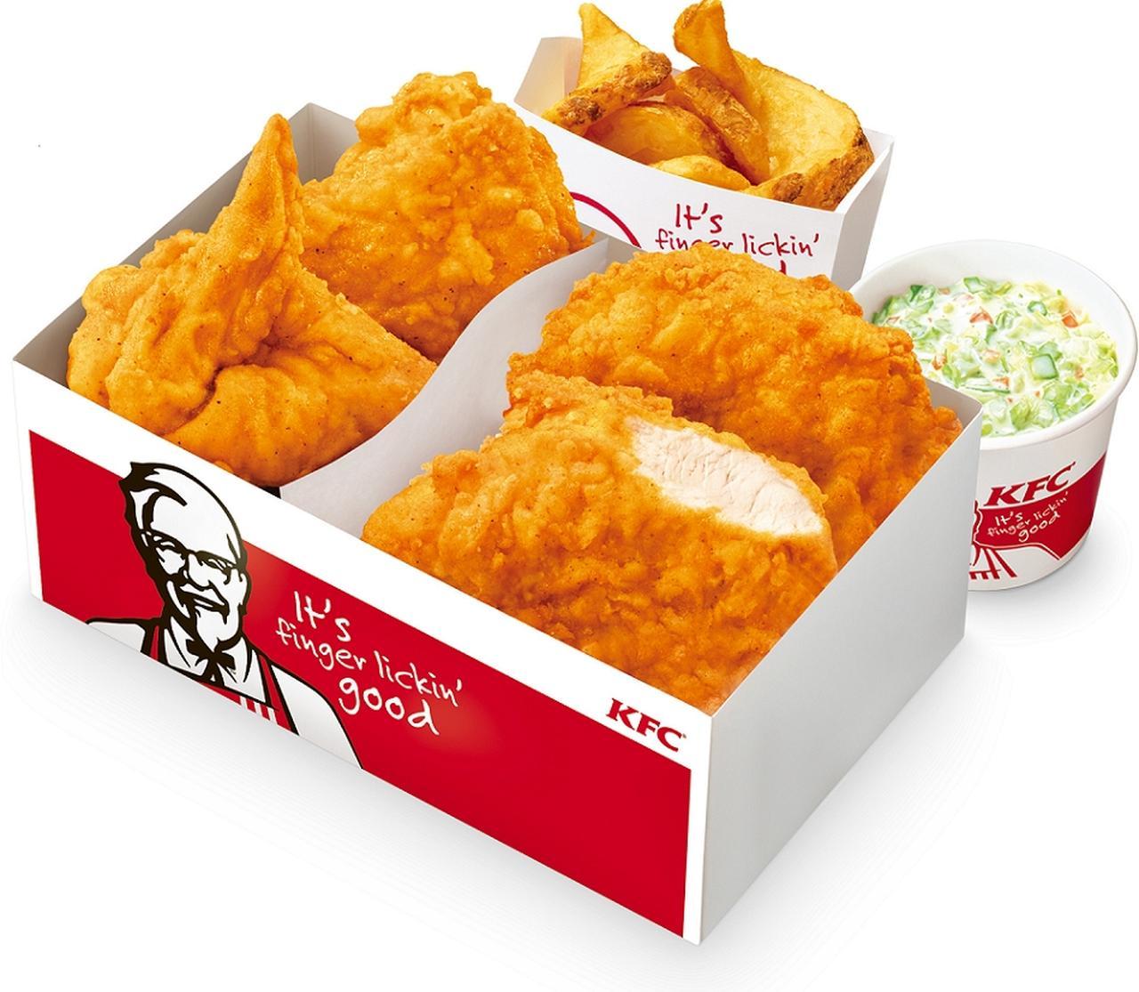国内産チキンを、KFC創業者カーネル・サンダース秘伝の11種類のハーブ&スパイスで味付けし、 店舗で1ピースずつ丁寧に手づくり調理する、 こだわりのおいしさ「オリジナルチキン」と「骨なしケンタッキー」に、人気のサイドメニューが選べるお得なパック。