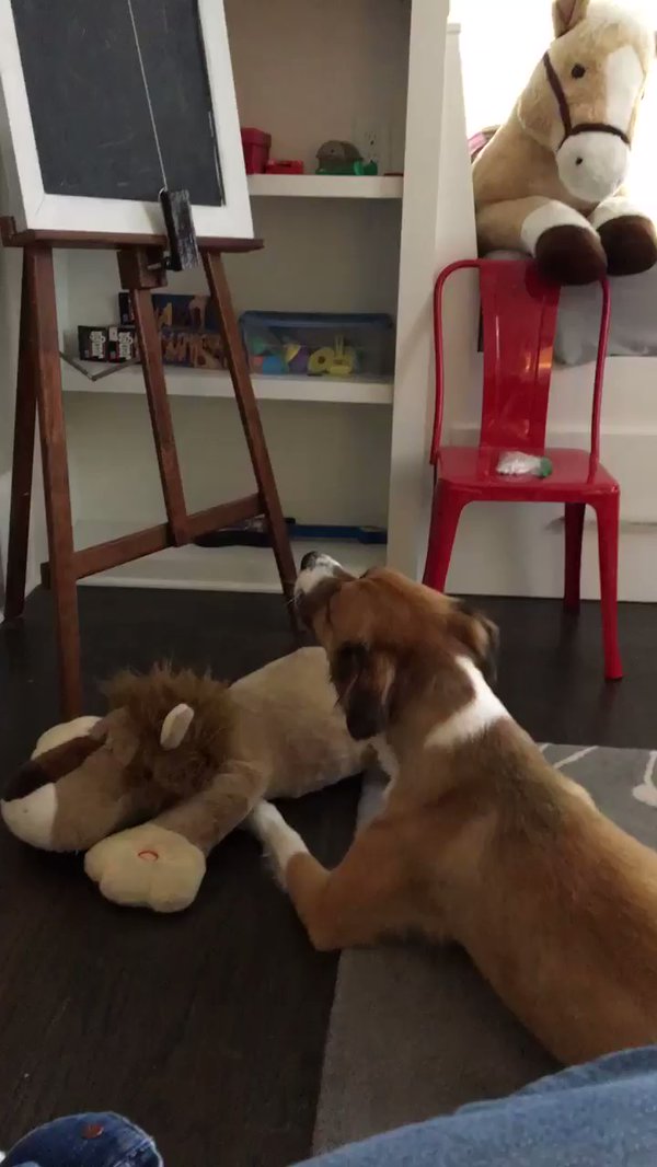 「ドジャーはこのライオンのぬいぐるみをどこにでも持っていくほど大好きなんだ。手を押すと歌うんだけど、今日ドジャーはそれに仲間入りすることを決めたらしい」