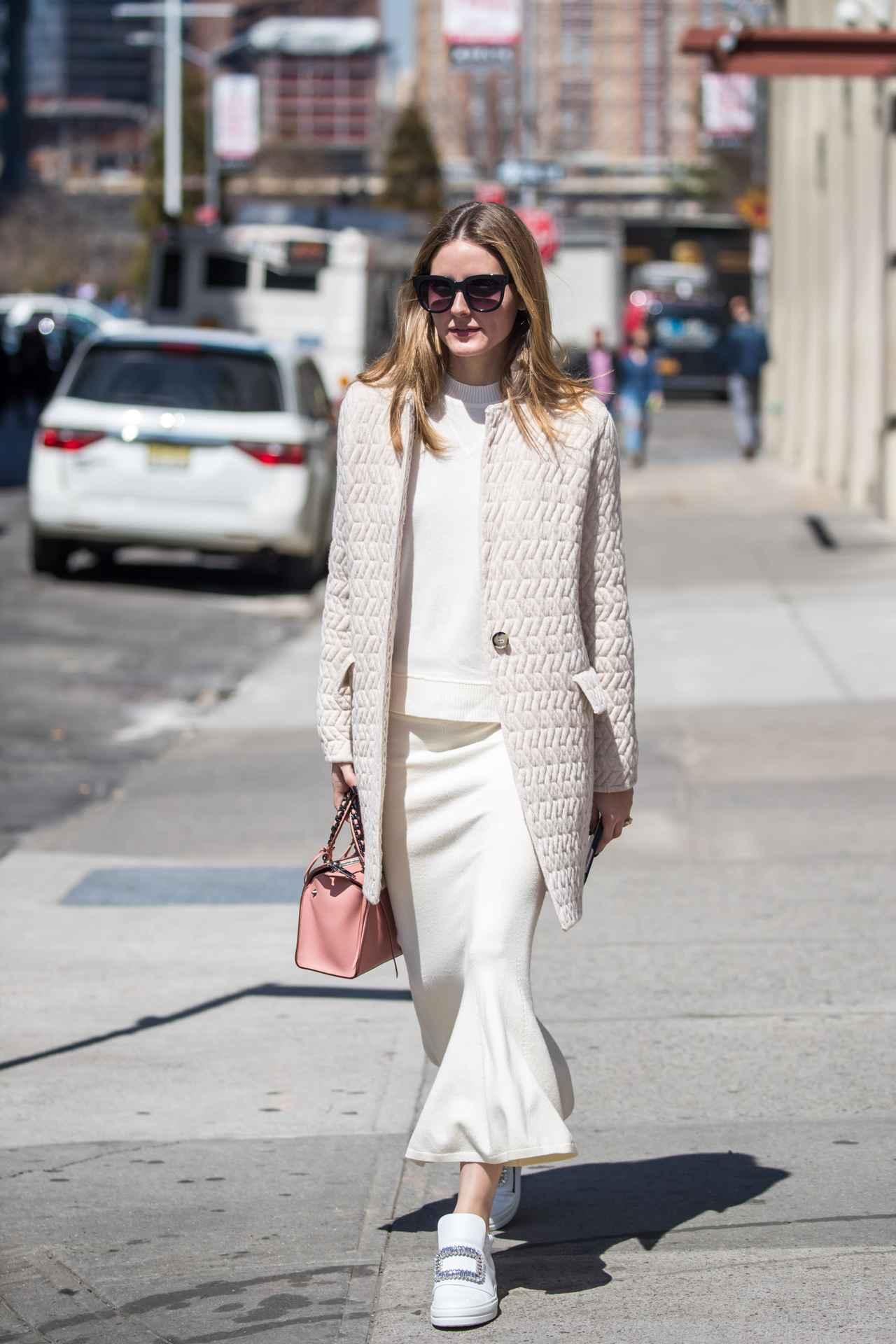 Chelsea28と自身がコラボしたコレクションから、ミディ丈のマーメイドスカートでエレガントにまとめたオリヴィア。トップスも白でまとめ、コートはクリーム色で全体を馴染ませて。足元はRoger Vivierのクリスタル付き白スニーカーでカジュアルダウン。バッグはELENA GHISELLINI。