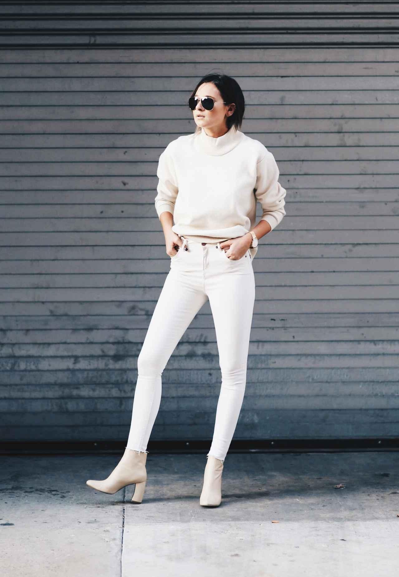 裾がフレイドヘムになったクロップト丈のTOPSHOPの白デニムには、クリーム色のタートルネックのニットを。STELLA McCARTNEYのブーツはニットの色とリンクしてクリーム色で。ティアドロップ型のサングラスでメンズライクに。