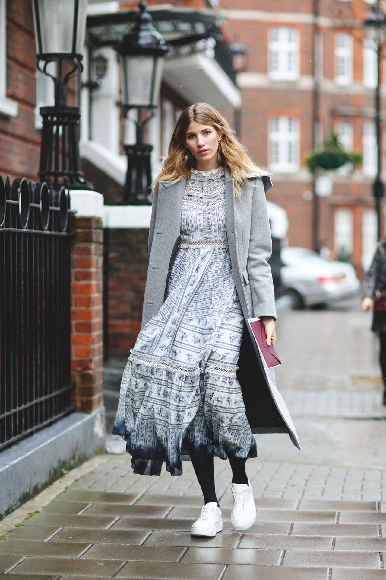 小花柄と小ぶりのフリルが可憐なイメージのミディ丈ドレスの上に、グレーのジャケットコートを羽織り、冬色を意識したヴェロニカ。足元は黒タイツでしっかりと防寒し、白スニーカーでカジュアルにハズして。