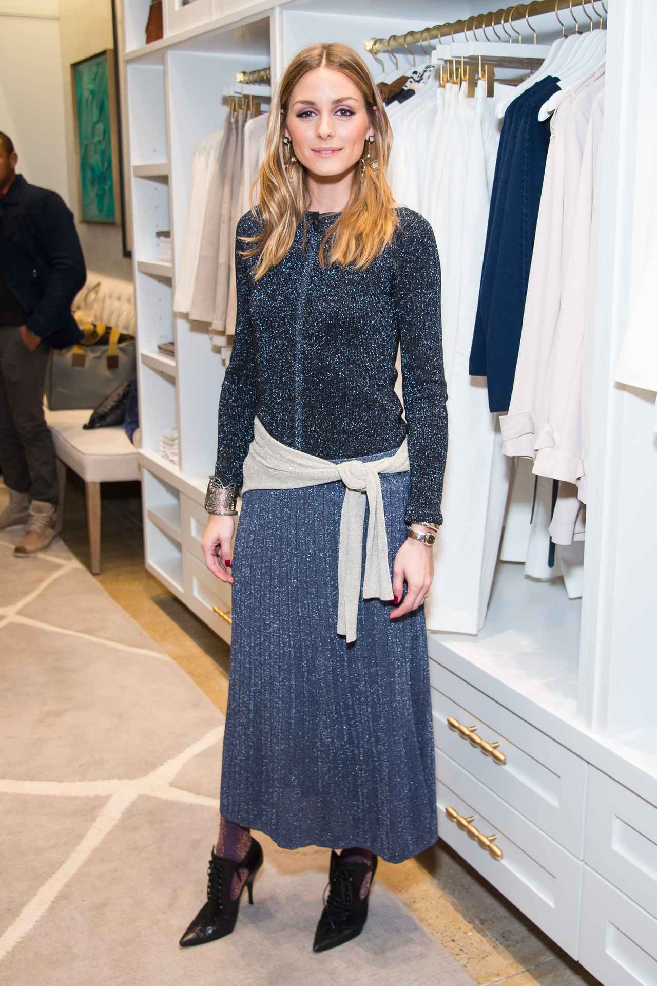 秋らしいカラーブロッキングがされたファーニットに、ピンストライプ柄のプリーツスカートでレディにまとめたマリア。シアーな黒タイツにシンプルなパンプスで、さらにフェミニンムードを盛り上げて。