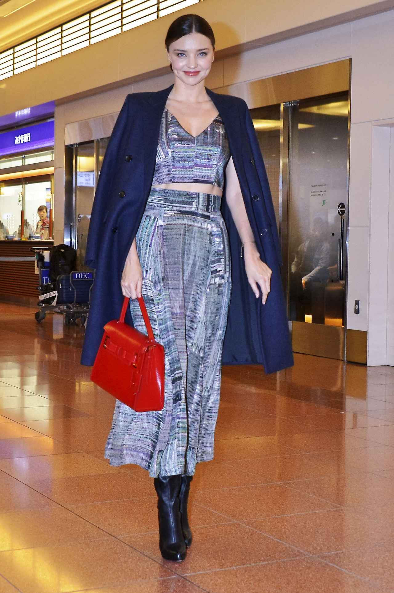 パープルやグレーが入ったマーブルのブラトップとミディ丈スカートのセットアップに、ネイビーのコートを肩掛けし、大人の余裕を見せたミランダ。そこに黒のロングブーツを投入して、足元が冷えるのをしっかりガード。