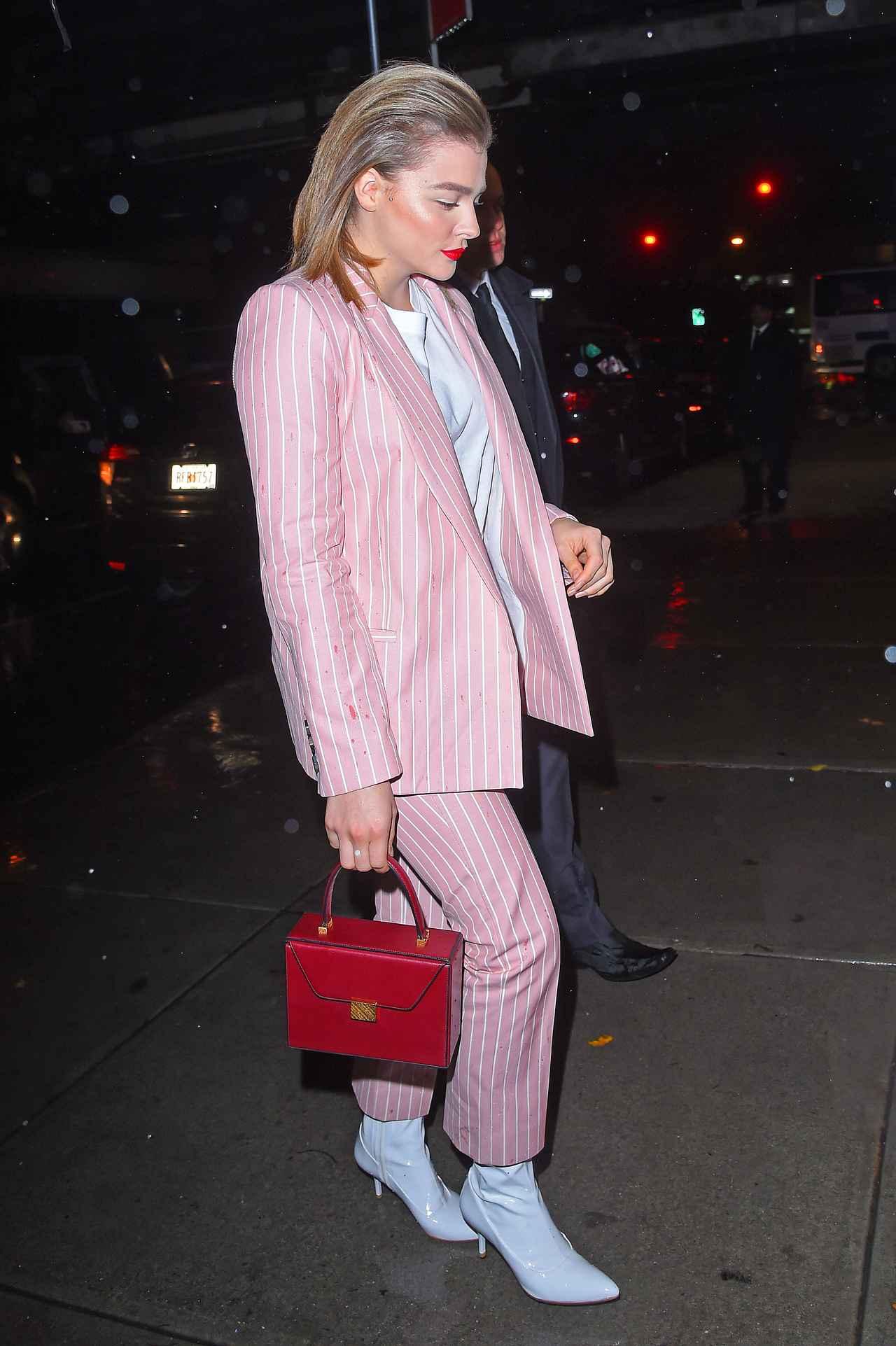 現在彼氏ブルックリンが暮らすニューヨークに滞在中のクロエは、ピンクのストライプスーツ姿で登場。