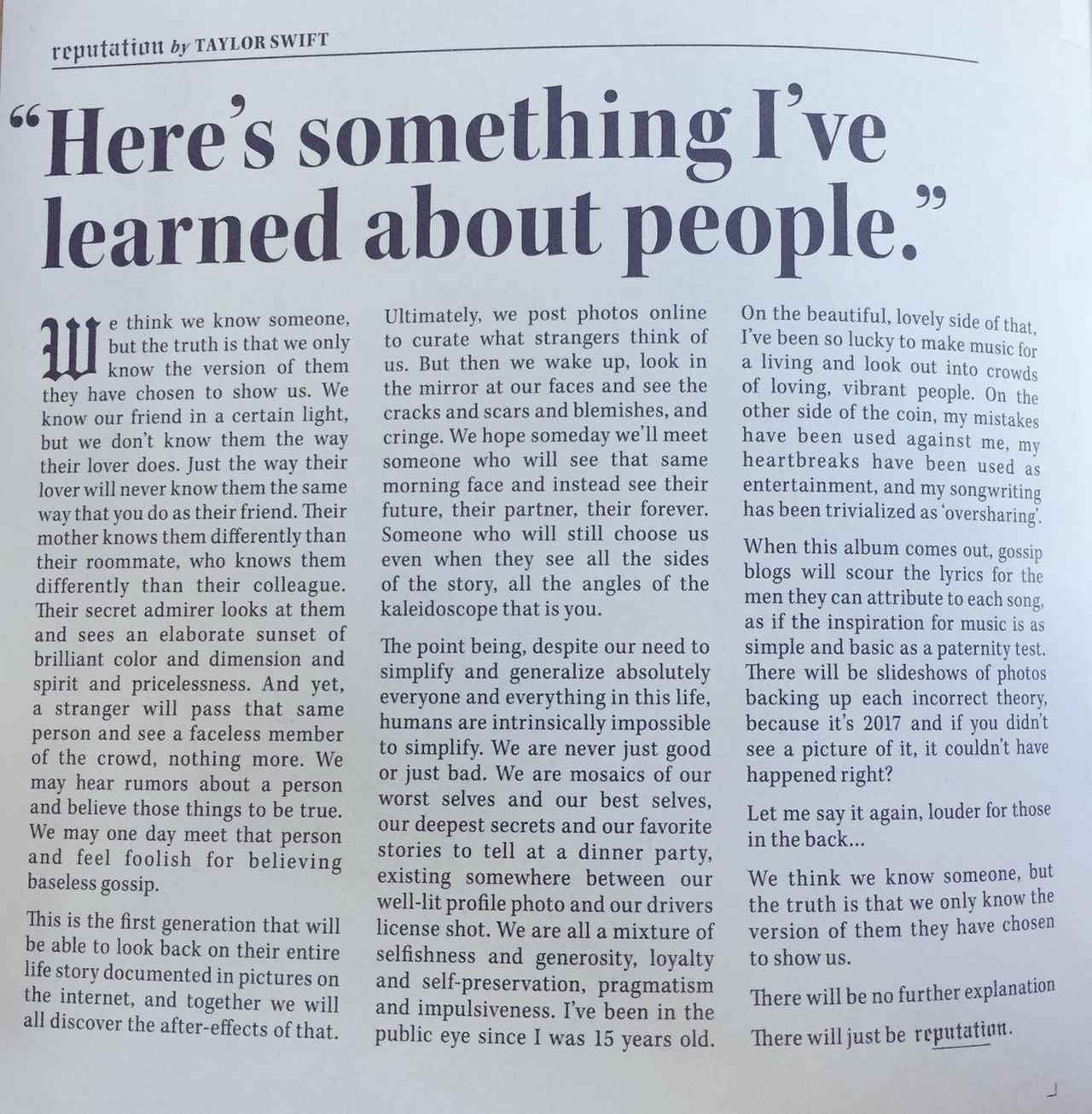 そこに書かれていたのは、テイラーのアルバムのタイトルでもある「レピュテーション(評判)」に通ずる、ネット世代への警告とも言えるメッセージだった。
