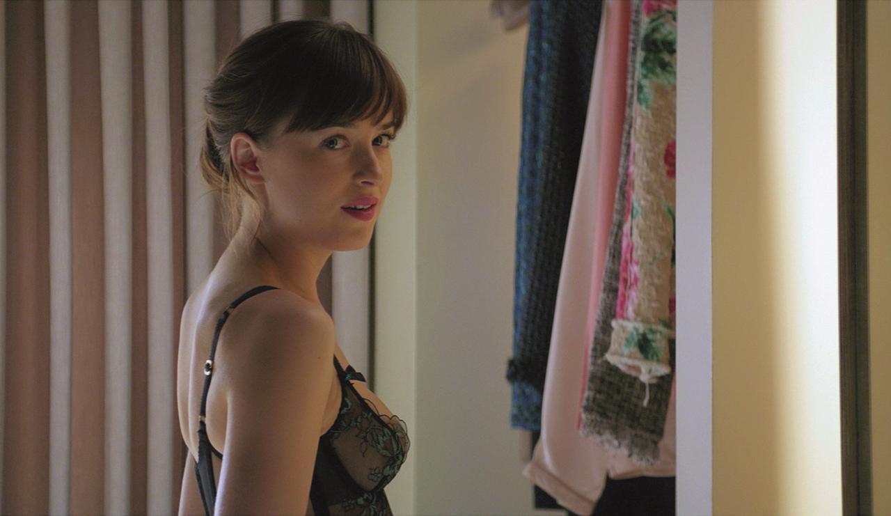 グレイが指定するメリー・ウィドウなランジェリーに身を包むアナ。劇中のラグジュアリーなランジェリーや衣装にも注目が集まっている。