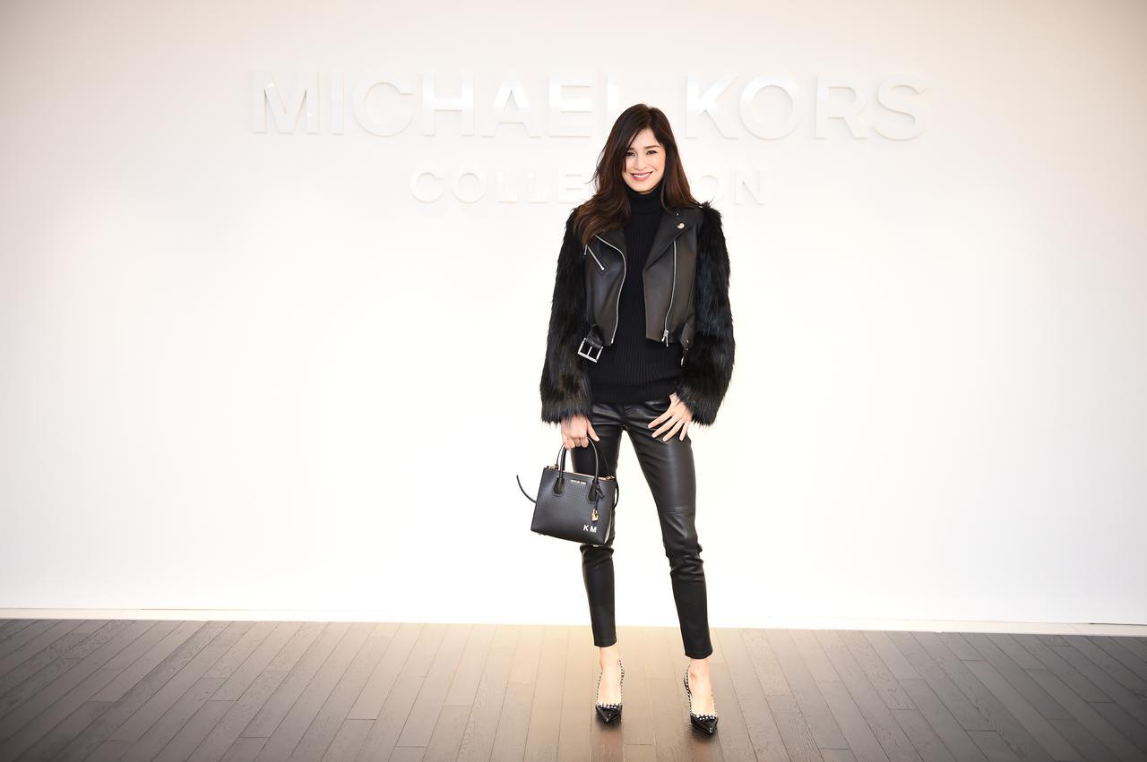 モデルのKELLYは、クールなレザーパンツに、レザーとファーの異素材ミックスがトレンド感を醸すジャケットを合わせたリュクスなスタイルに、マイケル マイケル・コースのマーサーバッグを合わせたオールブラックなスタイル。