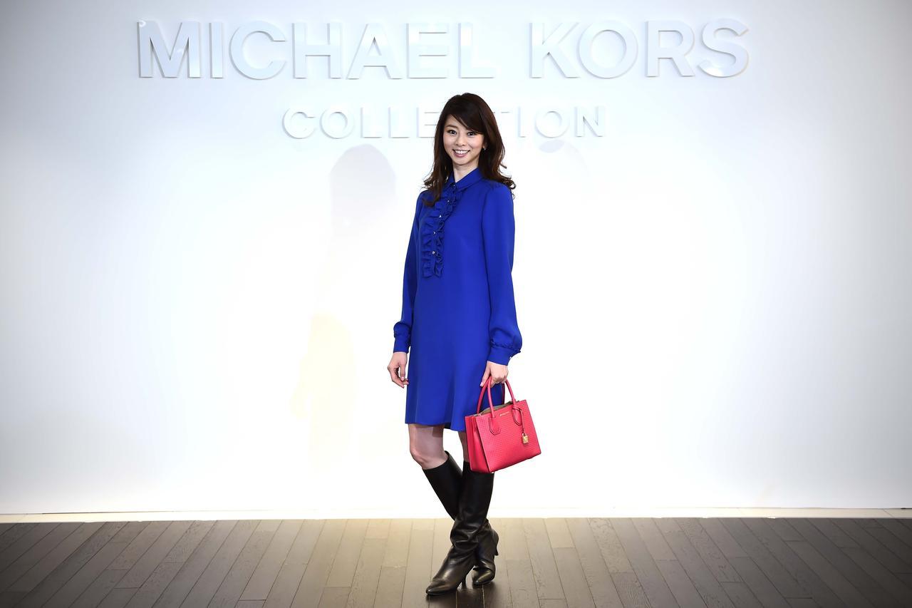 モデルのえれなは、マイケル・コースのフロントのフリルが上品にみせてくれるロイヤルブルーが鮮やかなワンピースに、あえて補色カラーのピンクのバッグを合わせてスタイリングを引き立てて。バッグはマイケル マイケル・コースのマーサーバッグ。