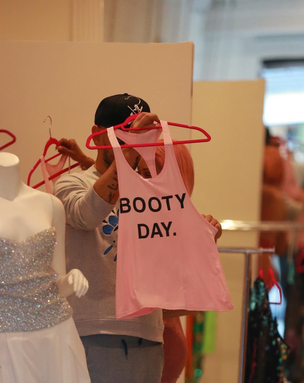 「これどう?」と言わんばかりにゲイリーがメラニーに見せつけるそのトップスには、「お尻の日(BOOTY DAY.)」の文字が大きく書かれている。