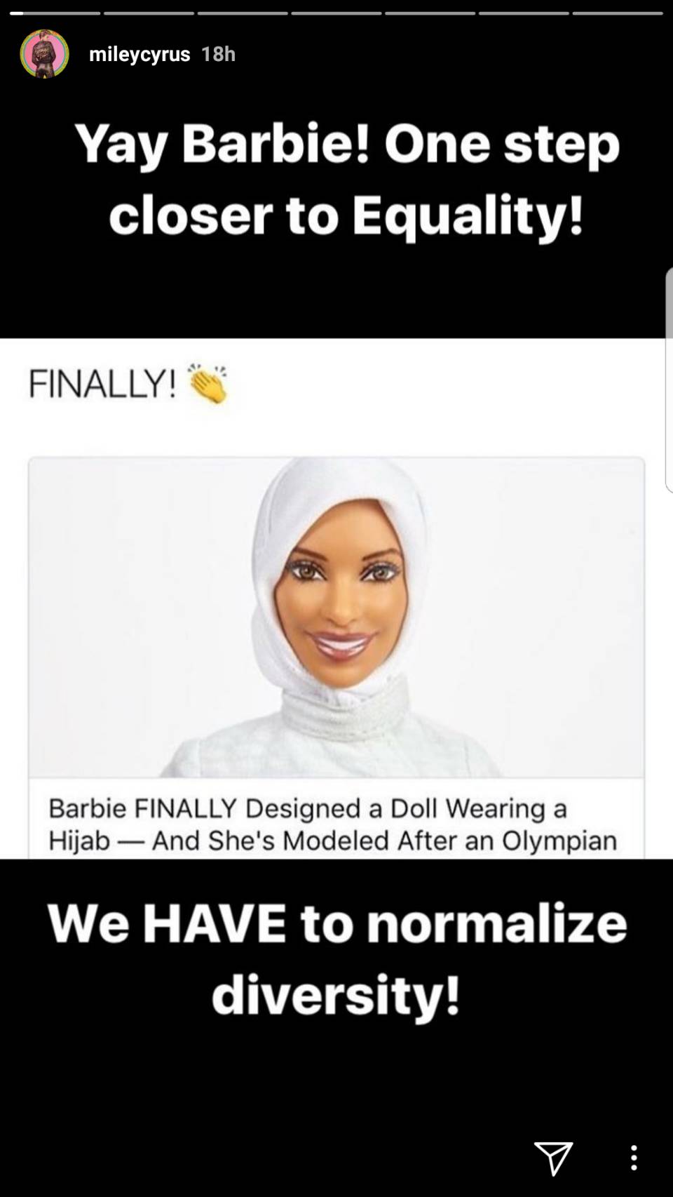 この歴史的な出来事に、すぐさま反応したのはシンガーのマイリー・サイラス。彼女はインスタグラムでヒジャブを被ったバービーの写真に「イエス、バービー!平等に一歩近づいたわ!多様性を普通のこととして受け入れないと!」と書き、喜びを表した。