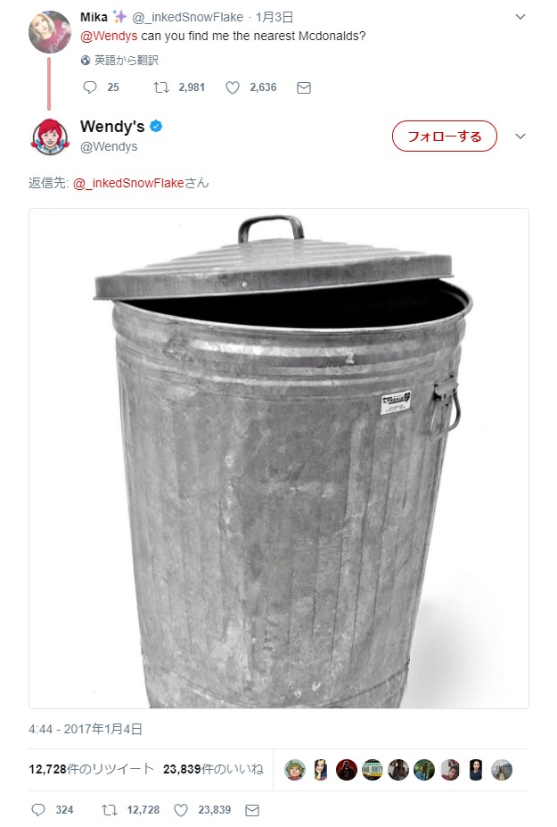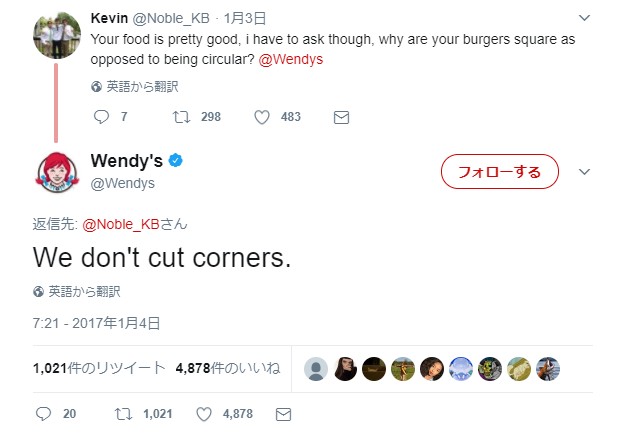 世界進出している人気のハンバーガーのファストフードチェーンである米ウェンディーズのツイッターに寄せられるちょっぴりイジワルなコメントへの返答が面白すぎる。