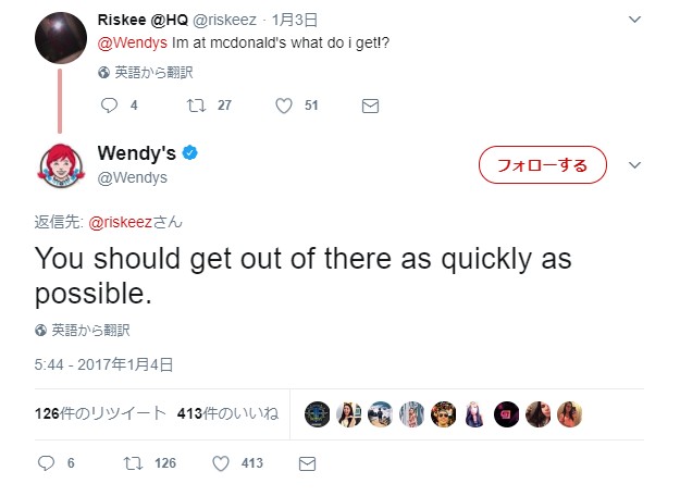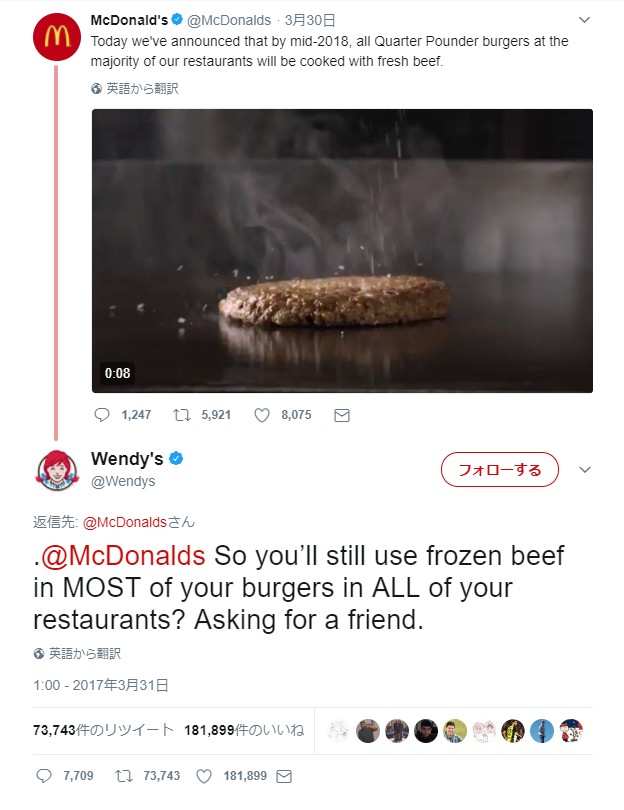 ウェンディーズは、マクドナルドに関するファンの質問回答だけでは足りなかったようで、米マクドナルドのツイートにも挑発的なコメントを残した。