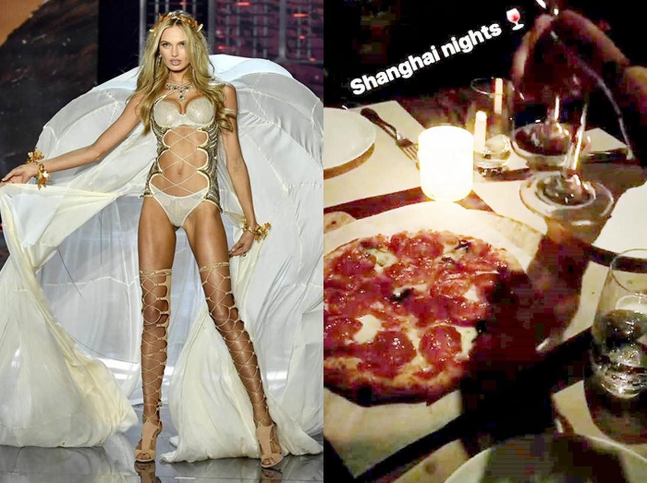 エンジェルのロミー・ストリドはワインで乾杯しながらピザを堪能する様子をインスタグラムのストーリーで公開。©Romee Strijd/ Instagram