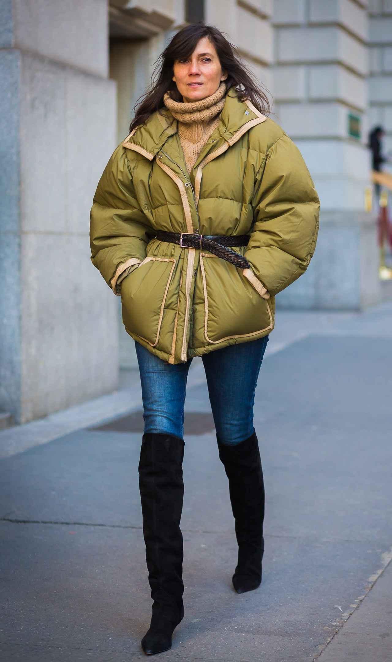 カーキカラーのダウンジェットにベルトでウエストマークしてメリハリシルエットを作ったエマニュエル。まだまだトレンドのサイハイブーツで美脚効果を意識。