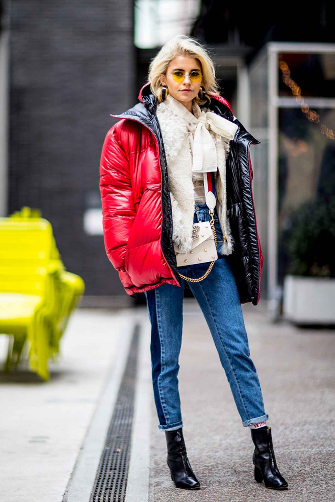 真っ赤なダウンコートで存在感をアピールしたジジは、サイドに赤のラインが入ったMOTHERのデニムでカラーリンクさせて。ブーツはSTUART WEITZMAN、サングラスはElizabeth and James。