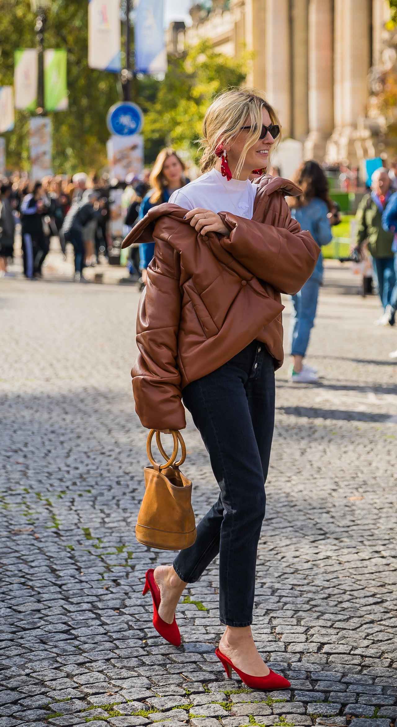 大人のエフォートレススタイルが得意なカミーユは、キャメルのダウンコートの片方の肩を落として着崩し、こなれたムードに。ピアスとミュールの色は赤で統一し、ポップなアクセントで遊び心を。