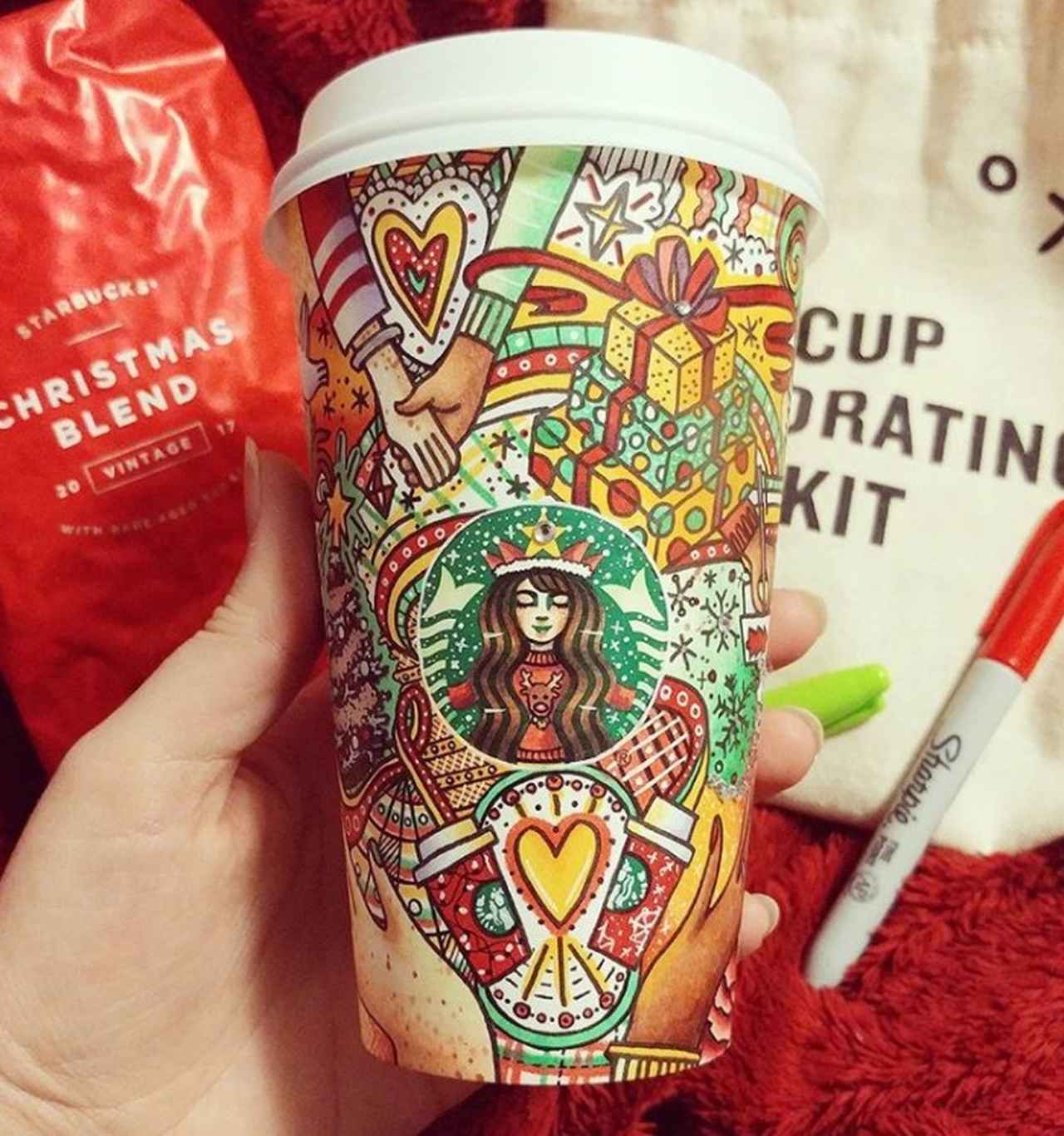 ちなみに、今季、スタバが期間限定で使用しているホリデーシーズン専用の紙コップで塗り絵を楽しむ人が増えていると以前お伝えしたけれど、キャラの手にかかるとこうなる!