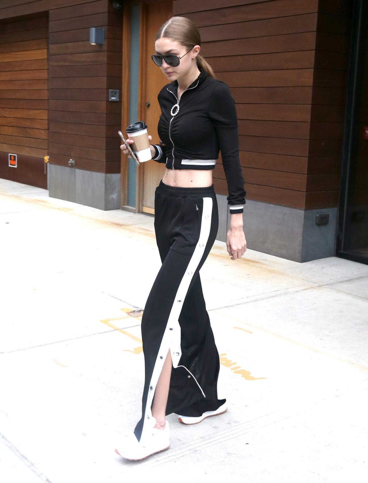 クロップト丈のパーカと、サイドにラインとスリットが入ったモードなAlessandra Richのセットアップを着こなしたジジ。足元はReebokの白スニーカーでスポーティにまとめて。