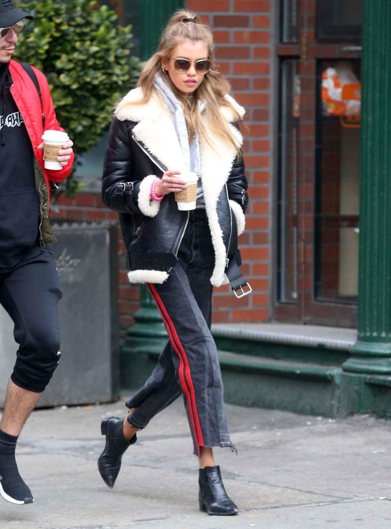 カジュアルなフーディにレザーのムートンコートを合わせたステラは、赤のサイドラインが入ったクロップトデニムで全体をすっきりまとめて。
