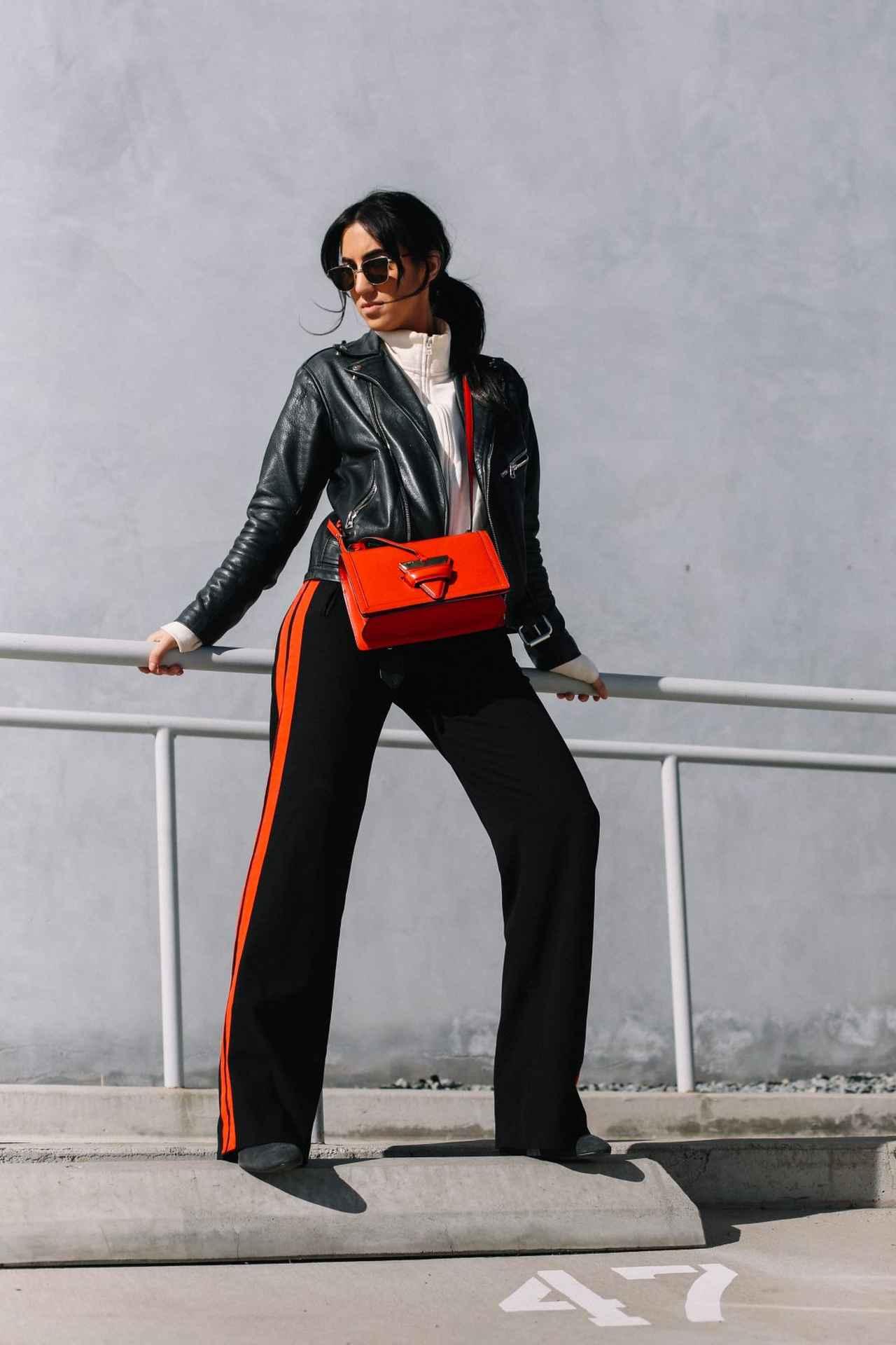 白のスウェットパーカーにZARAのサイドラインパンツをセットしてアスレジャー感を演出したタニアは、laerのレザージャケットでラグジュアリーにシフト。赤のラインに合わせたバッグはLOEWE。
