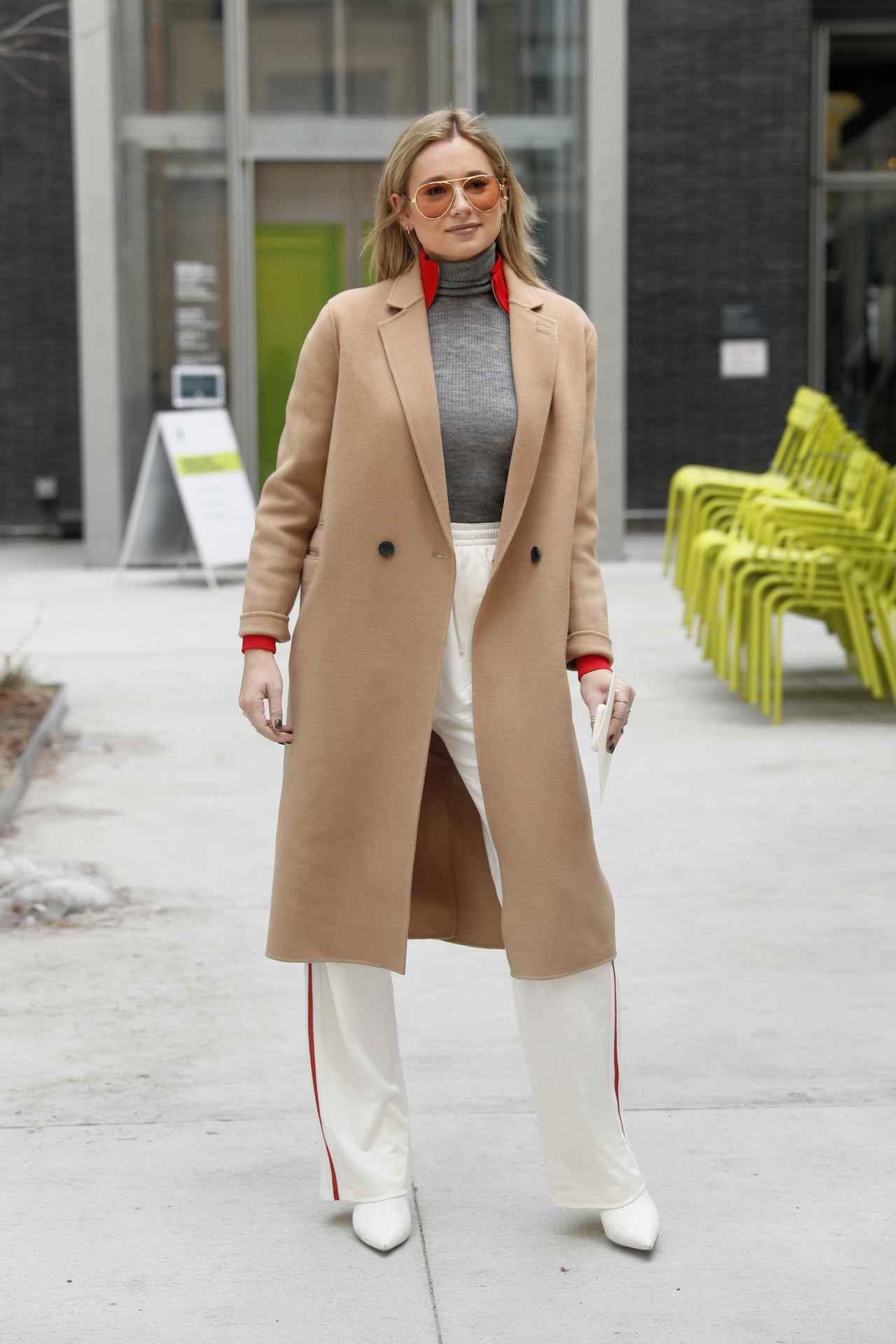 グレーのタートルネックにっとの上に赤のパーカをレイヤー。コートの袖からも赤をのぞかせ、そこに赤ラインが入った白のパンツを投入し、プレイフルにカラーリンクを。キャメルコートでマイルドな印象も。